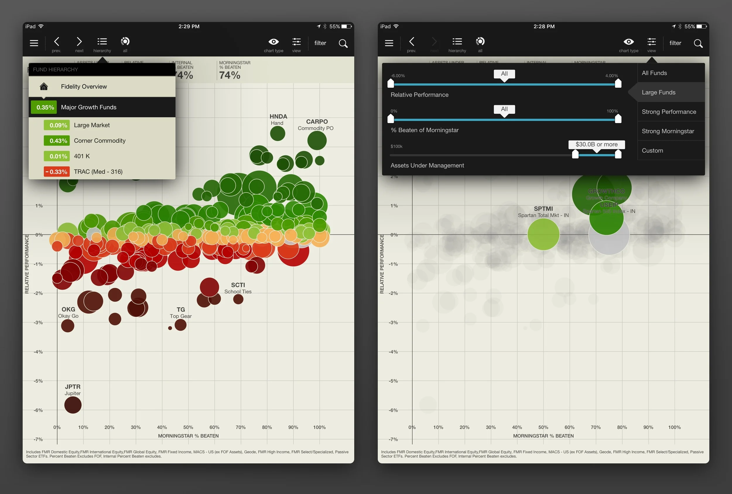 “How are my assets performing?” Every day Fidelity asset management executives, who are responsible for $1.7 trillion, ask that question. On their desks every morning is a stack of papers 100 pages deep in 6pt type, full of tables they need to wade through to get even the smallest partial answer. These executives asked if we could help them come up with a more elegant way to answer that question. Our solution provided them with an instant picture of performance; it sliced data across the organization, compared relative performance and performance over time and against peers, and provided many other features that have made the app indispensable across the organization. During his annual review of Fidelity’s performance in front of 200 leading investment professionals, Asset Management’s President Charlie Morrison did away with his traditional powerpoint deck and instead walked step by step through Fidelity’s performance using the app.